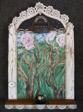 Wedding Gift: Flowers taken from Bride's boquet, Part of the wedding invitation used, the ceromony was amount many trees and the limbs of the trees have the music/songs played at their wedding written on them. Other treasures used: picket fence wood, found wood, vintage lace trim & doily border, antique drawer pull, various beads, and manipulated jewelry parts, a yard slae candle holder (to place a candle in and light in rememberance of the day!) as well as bottle caps.